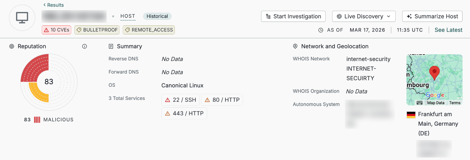 - Use reputation scores in the Censys Platform to quickly determine the potential risk associated with hosts, validated by transparent evidence in the Censys dataset.