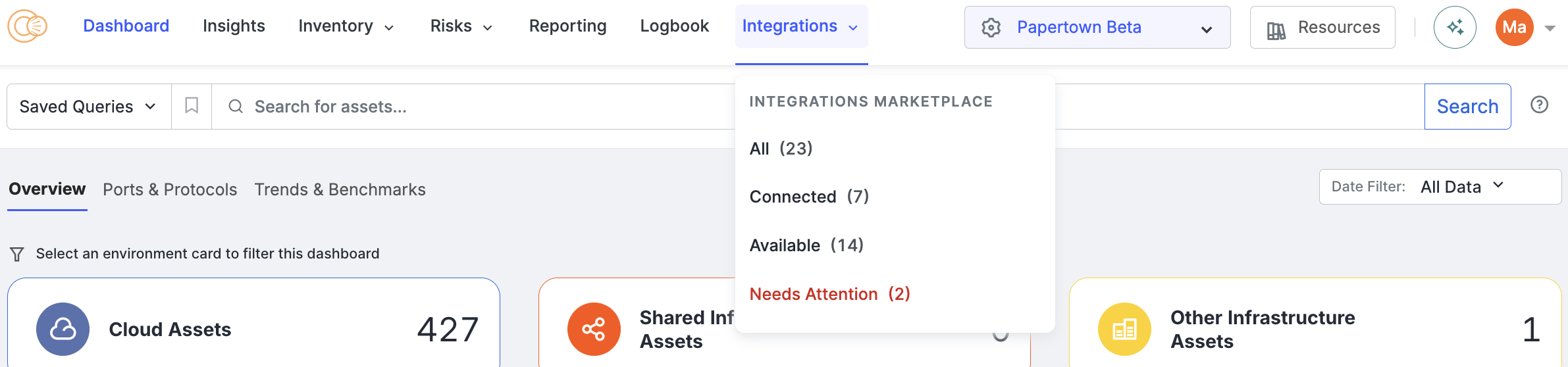 Added links to the Integrations dropdown to see all integrations, connected integrations, available integrations, and integrations that need attention.