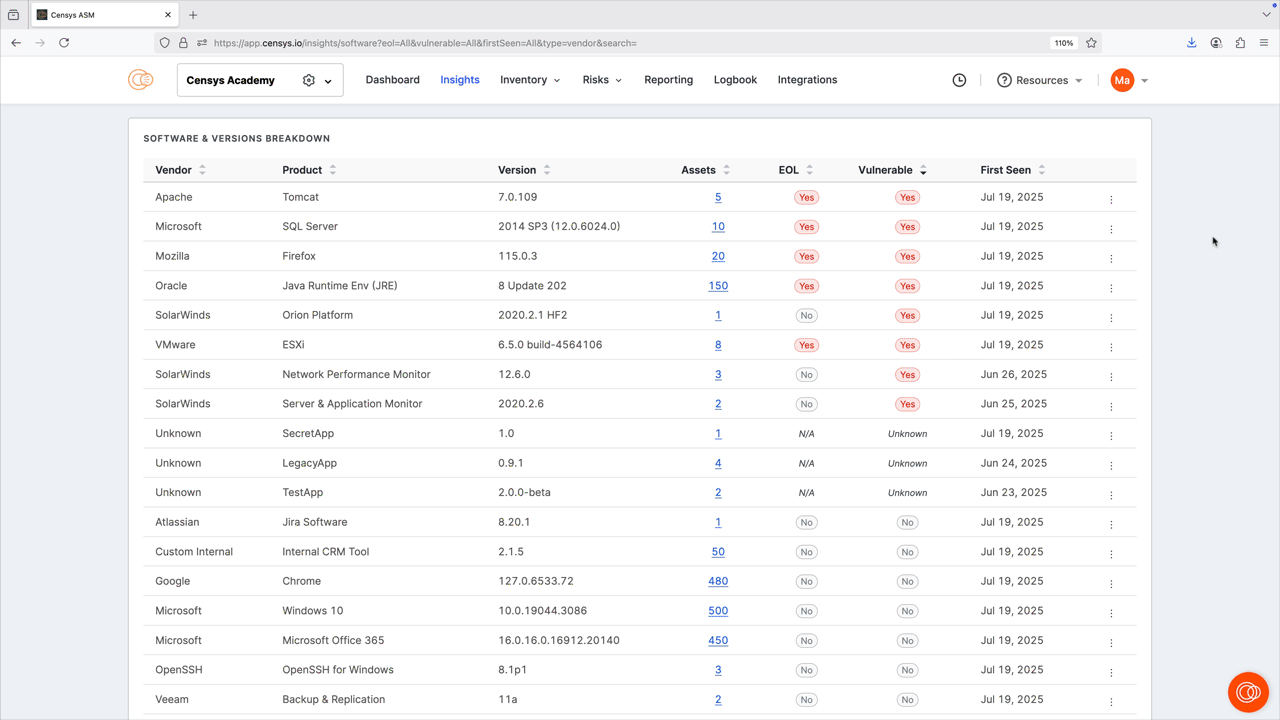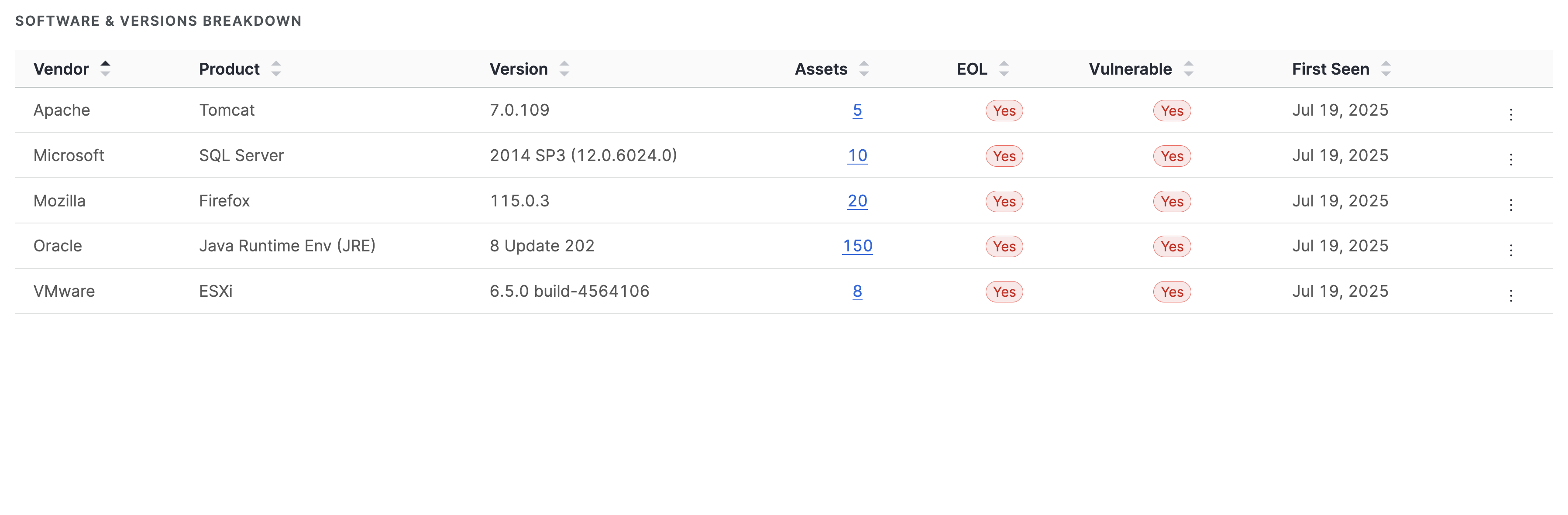 The software & versions breakdown report provides a detailed list of the software present in your inventory, and can be sorted by vendor, product, asset count, and more. Click the linked asset count values to see all results for the indicated software.