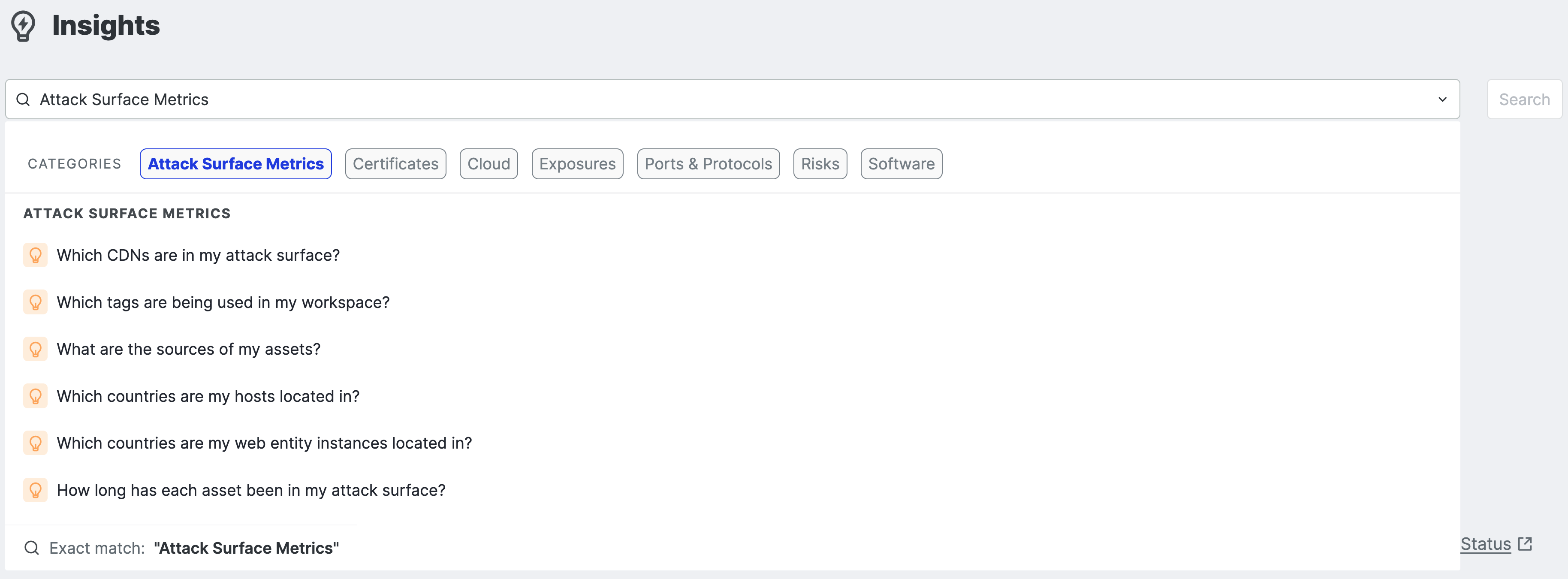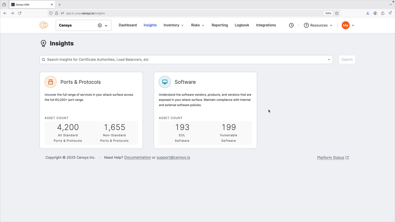 Insights in Censys Attack Surface Management (ASM) organizes and presents key data points about your attack surface, like the state of your inventory's software and services, in an understandable and easily actionable format. The Insights search bar provides several pre-formatted prompts to help you investigate your inventory and learn how to build useful ASM queries.