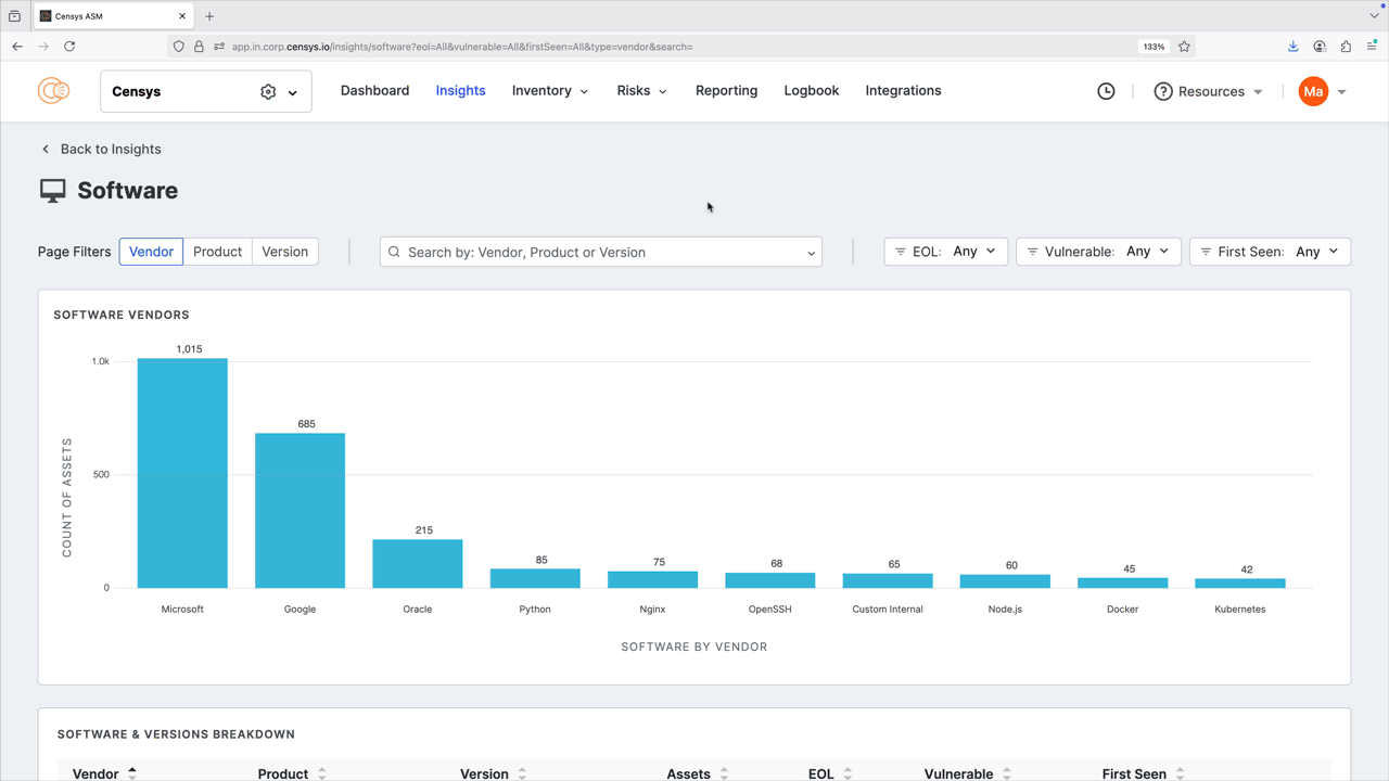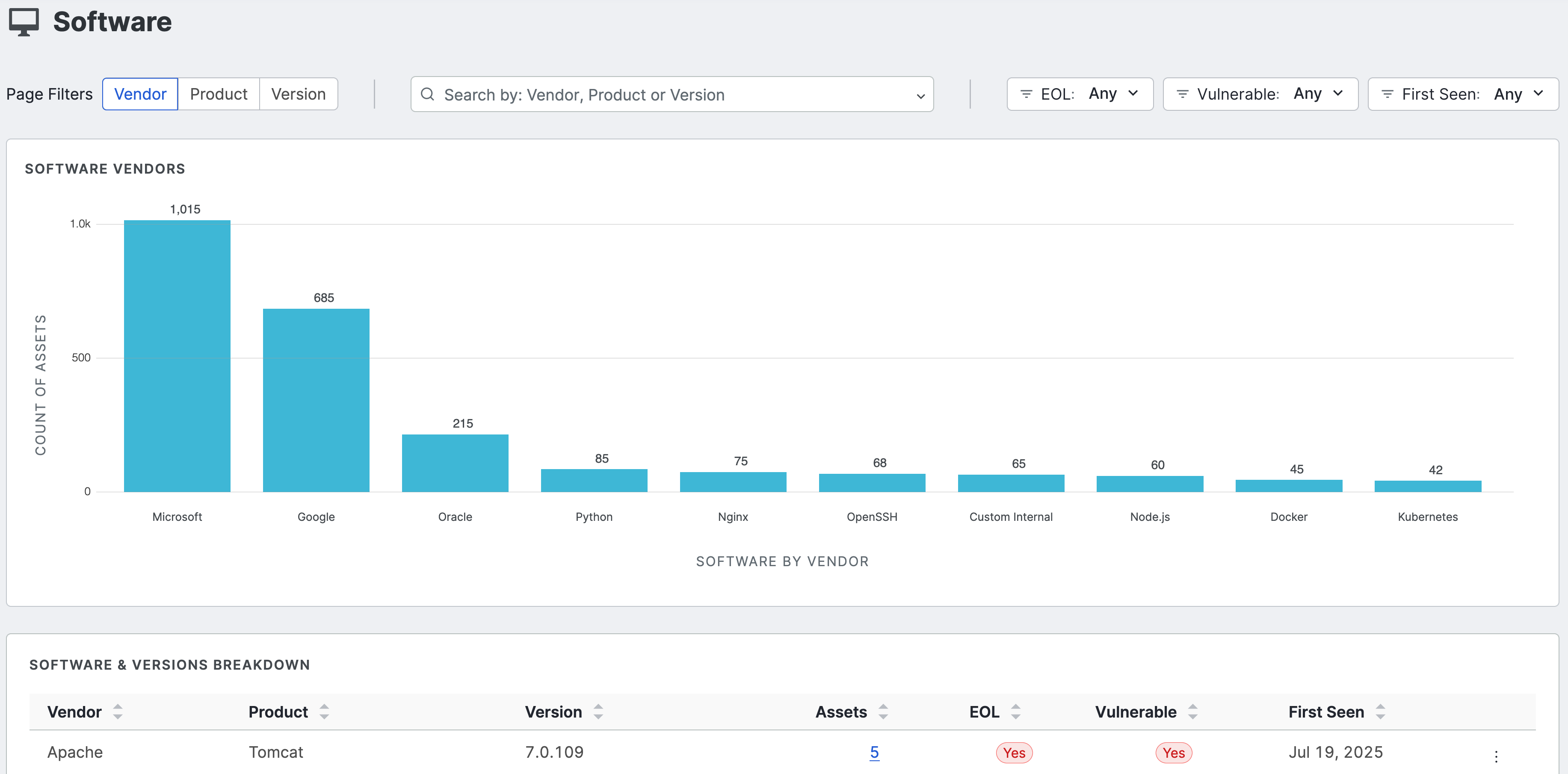 You can filter and search by vendor, product, and version number. You can also filter by end-of-life (EOL) status, whether the detected software has any vulnerabilities, and when the software was first seen in your attack surface to help you prioritize remediation. Note that the filters you apply affect the entire dashboard view. Click any of the bar plots to see all results for that plot in your inventory; note the pre-built query used to find the results.