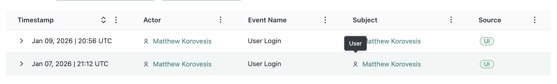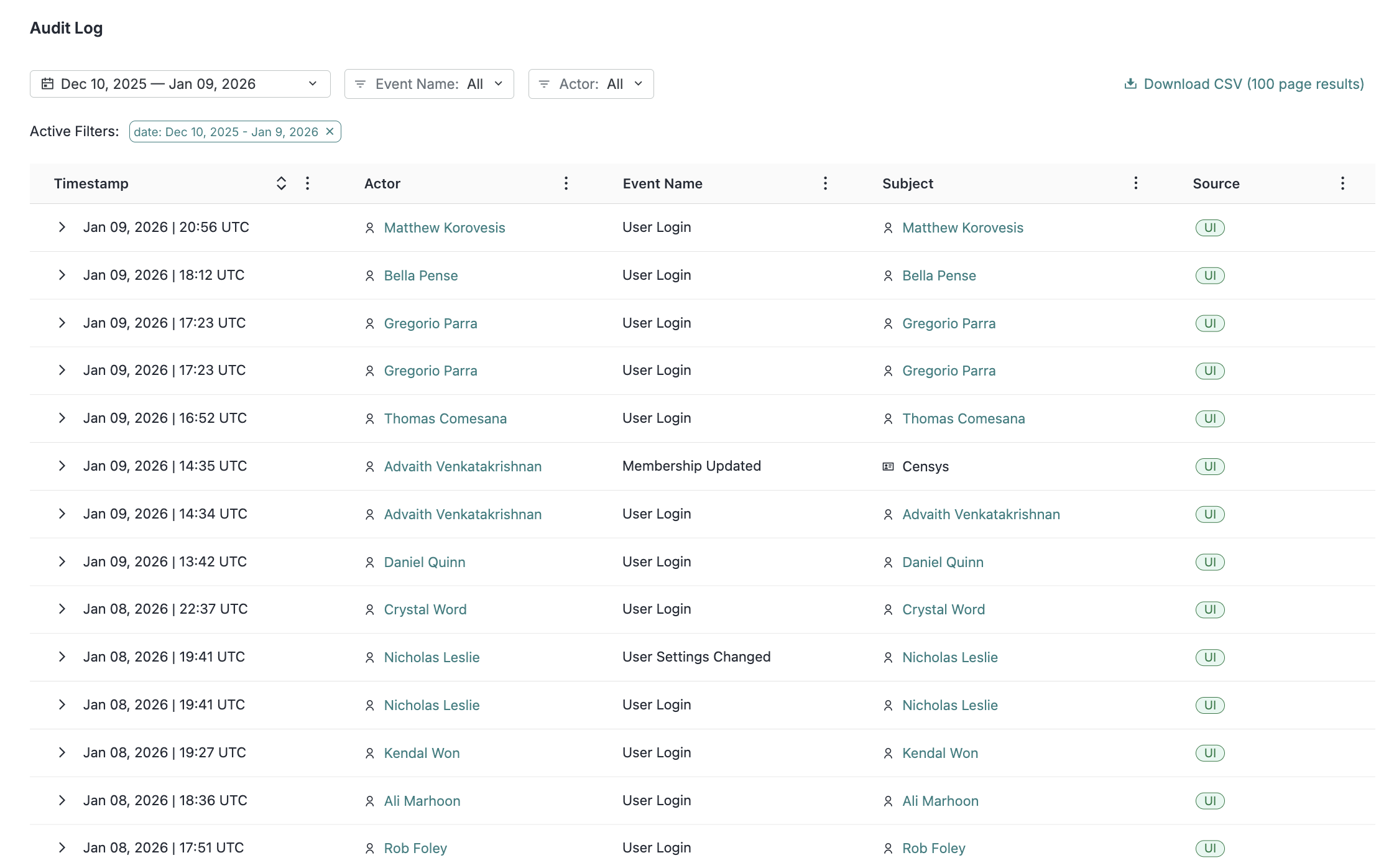 Use the time range, Event Name, and Actor filters to find events of interest. Event names include actions like user login, Personal Access Token (PAT) creation and deletion, user role changes, and user MFA and password changes. Actors are Censys users or, in some cases for automated events, Censys systems.