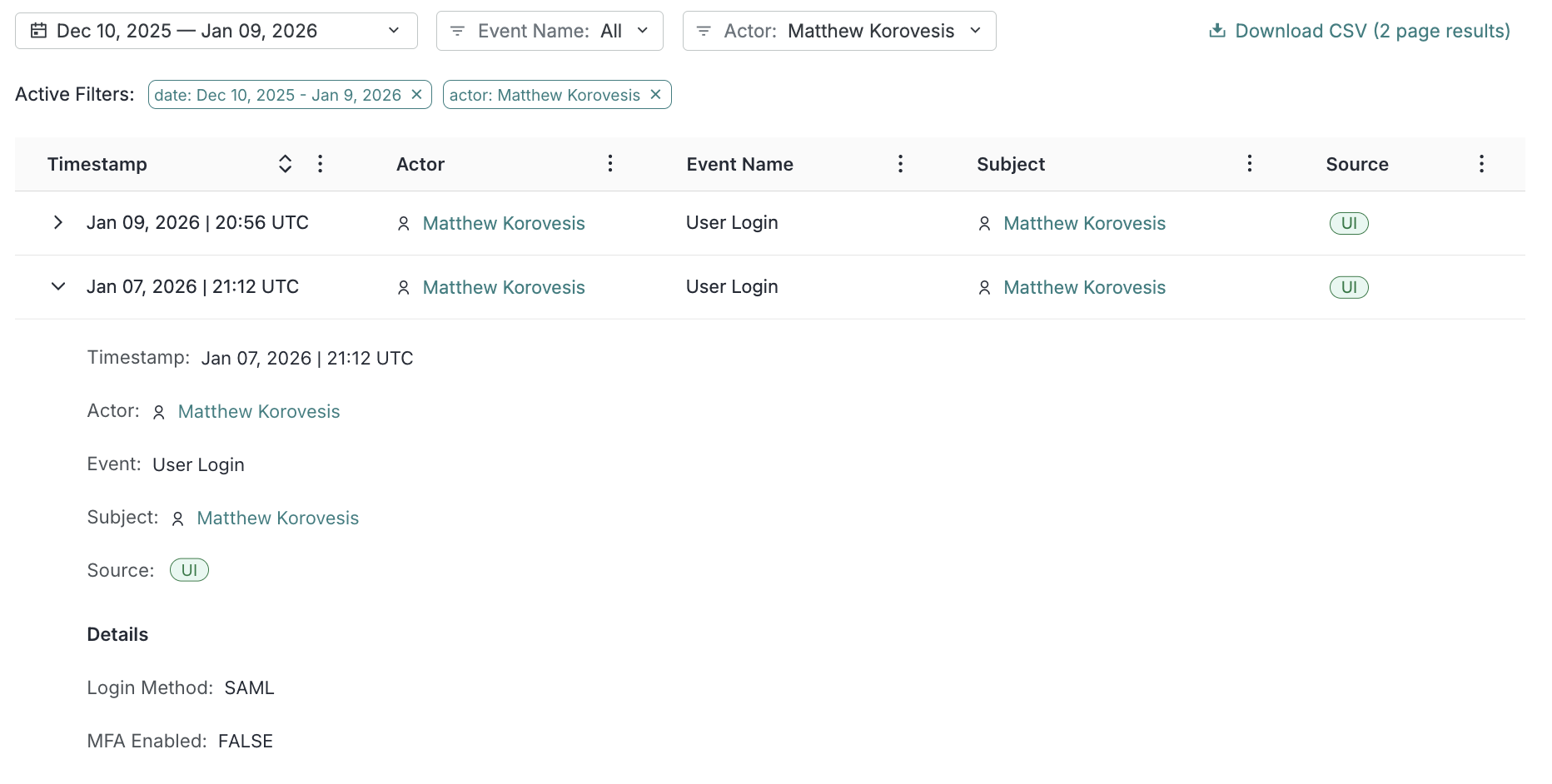 Click Download CSV in the top right corner at any time to download your filtered audit log results.