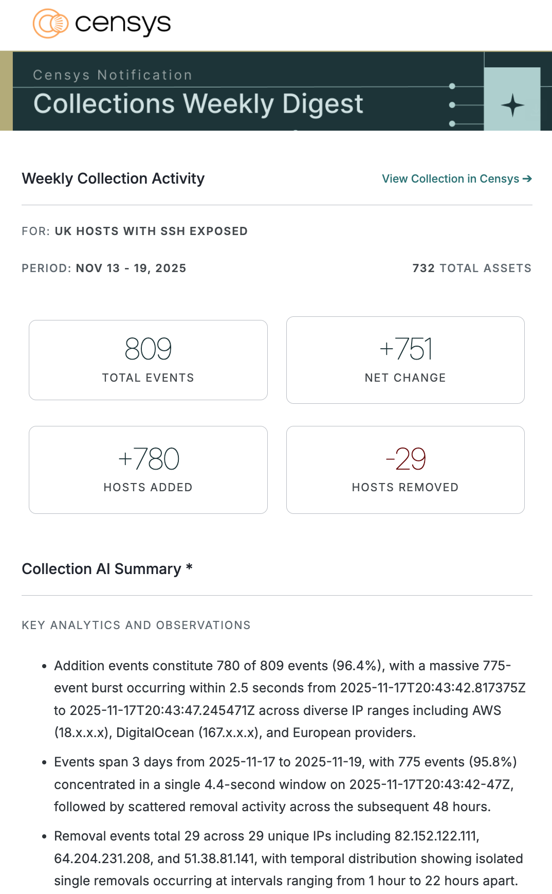 Digest emails are sent once every Monday at 06:00 UTC. Each email includes a breakdown of total events, net change in collection assets, the number of assets added, and the number of assets removed over the previous seven days.
