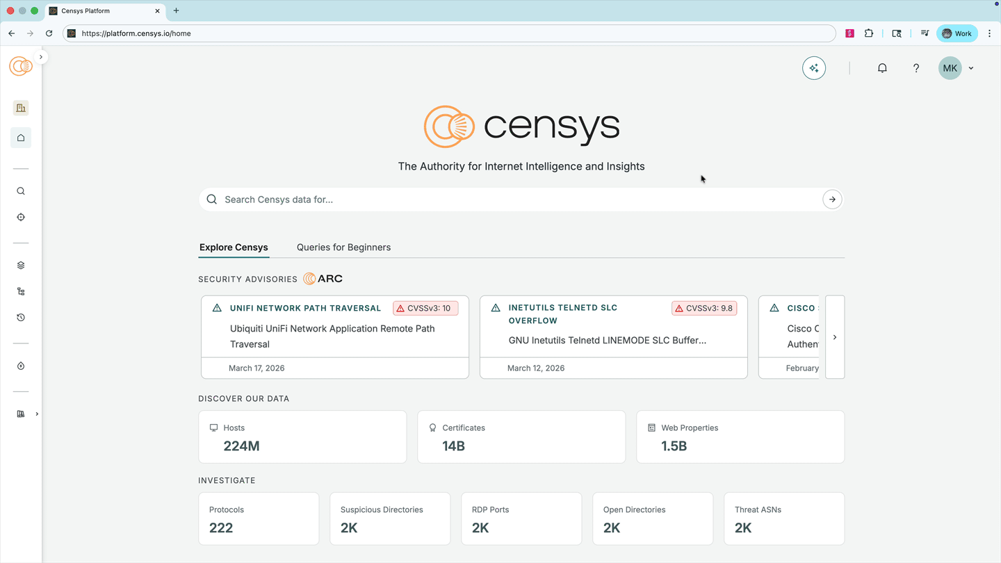 - Enter your credentials. Once you sign in, you land on the Censys Platform interface.