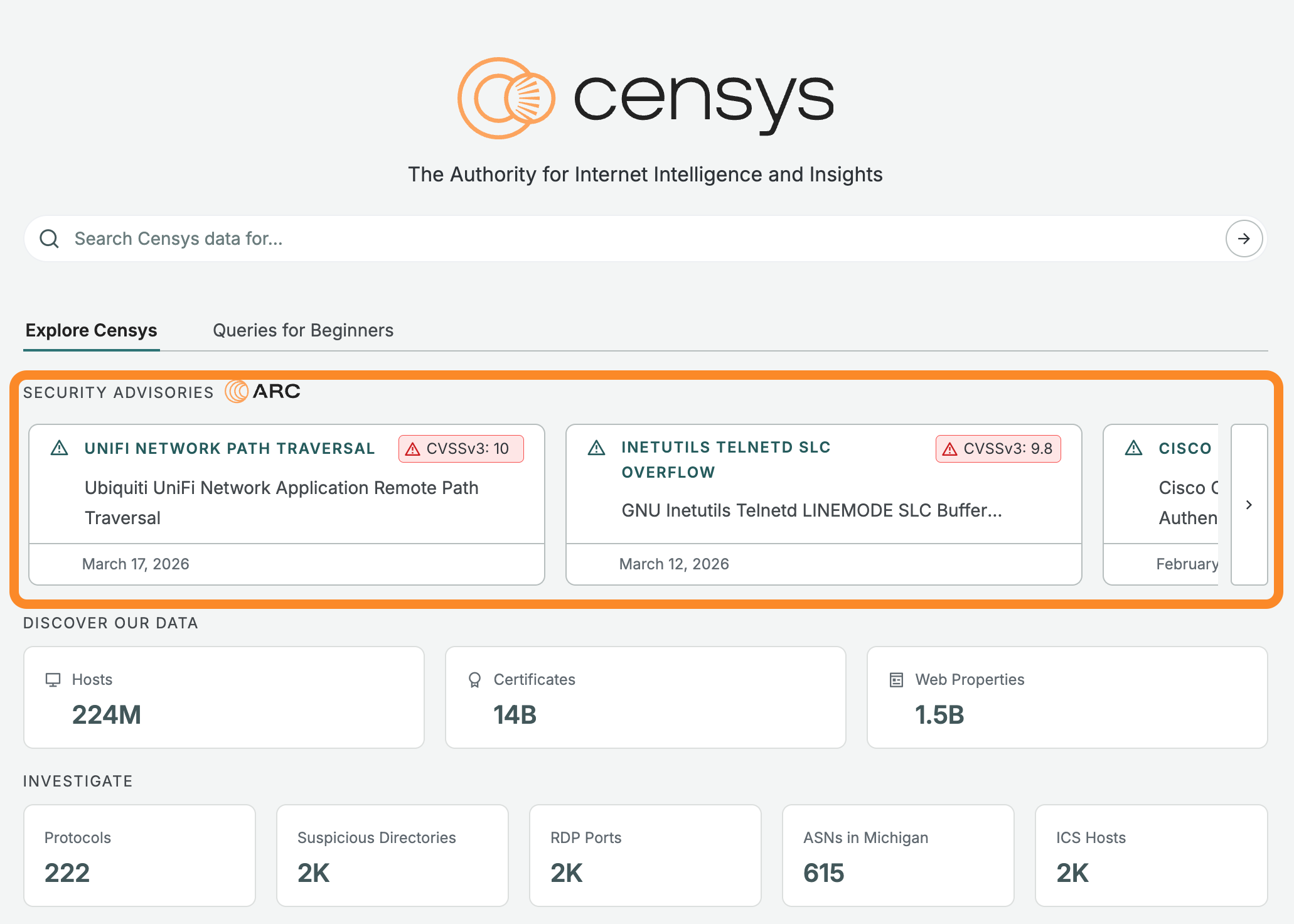 ARC, Censys' cybersecurity research team, frequently releases new advisories and queries for trending security issues. These are shown in a carousel under the search bar. Use these queries to track important issues and learn how to build your own targeted searches. Most of these queries utilize data that is available to Censys Free users, but sometimes they will use regex or other entitled fields.