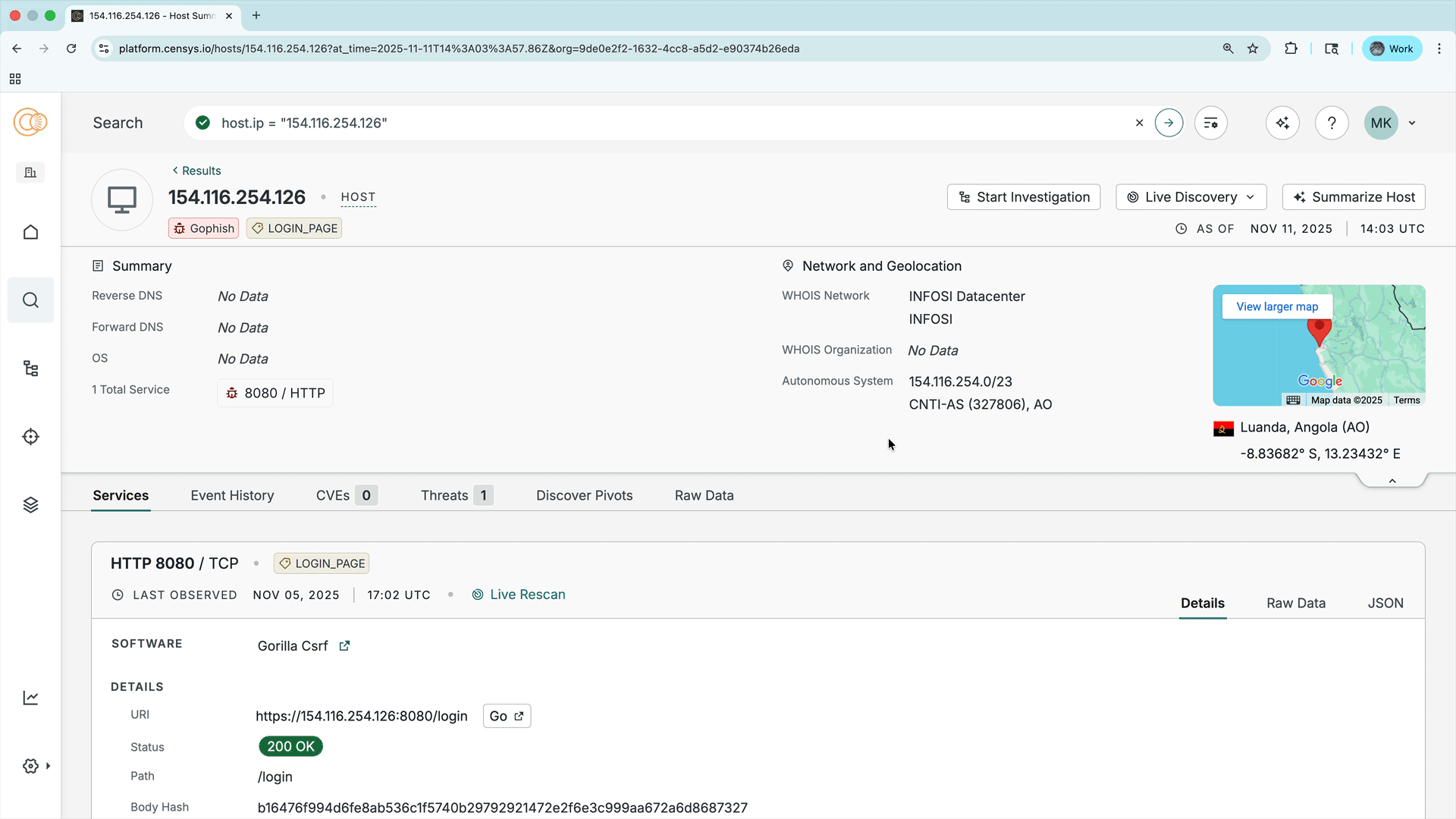 The Platform host dataset consists of current records of internet-facing IPv4 and IPv6 hosts. Each host is identified by an IP address and includes detailed information about exposed services, such as IP addresses, protocols, software, and ports. Use the Platform to search structured host fields such as service details, DNS names, location, and known vulnerabilities.