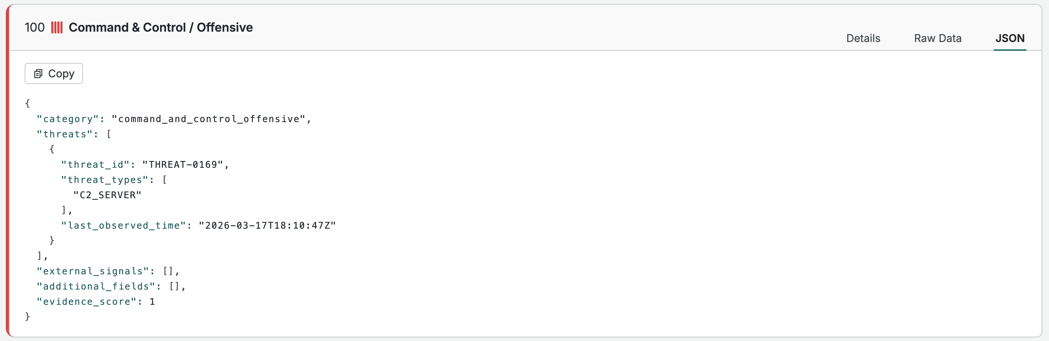 The JSON view of evidence for the command and control category on an example host.