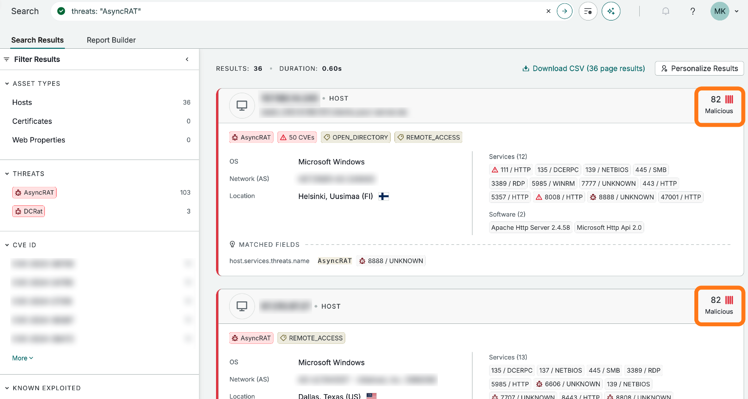 Command and control (C2) and offensive tooling infrastructure | Whether tools associated with C2 or offensive operations were detected on a host. This is one of the strongest indicators of malicious intent in Censys methodology. Examples include hosts running known malicious tools like AsyncRAT, Cobalt Strike, and so on. |