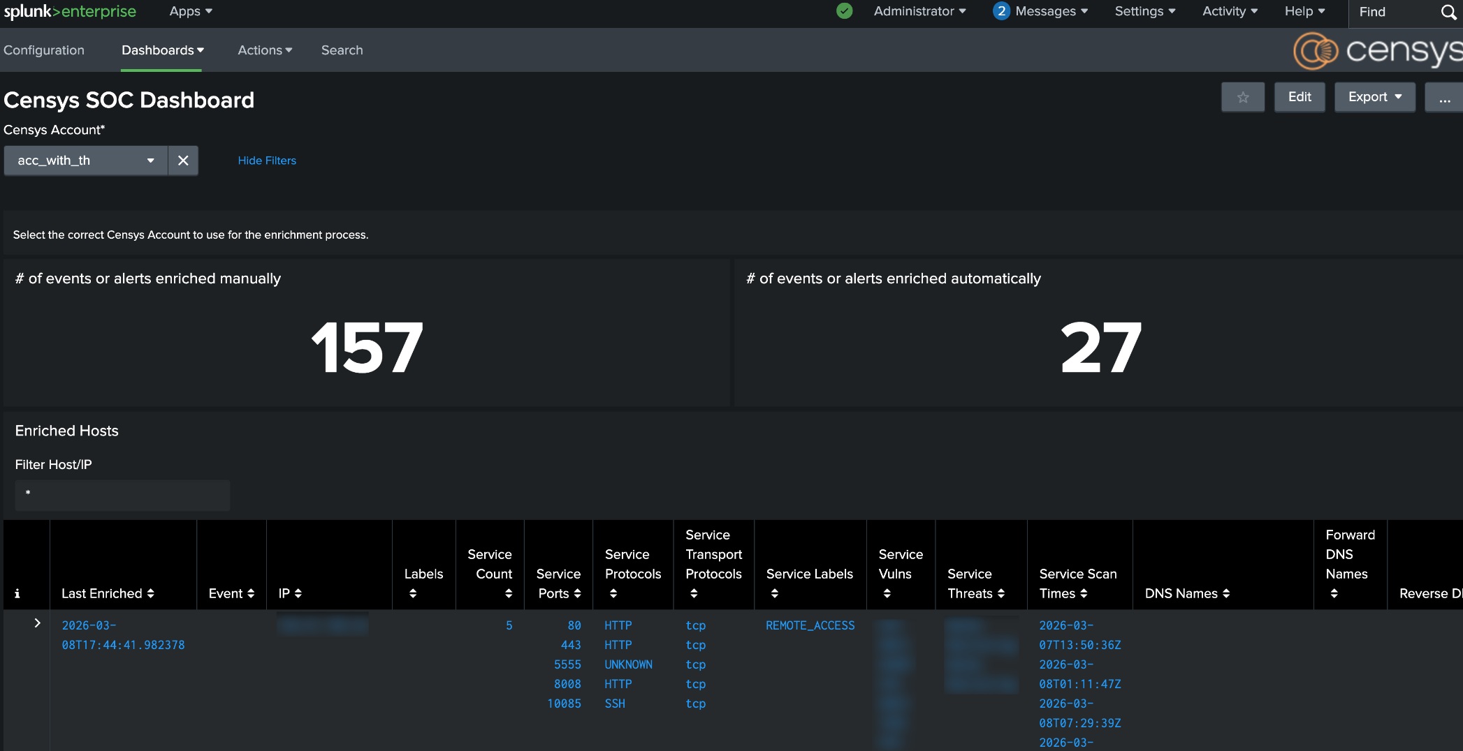 Censys for Splunk Platform SOC dashboard
