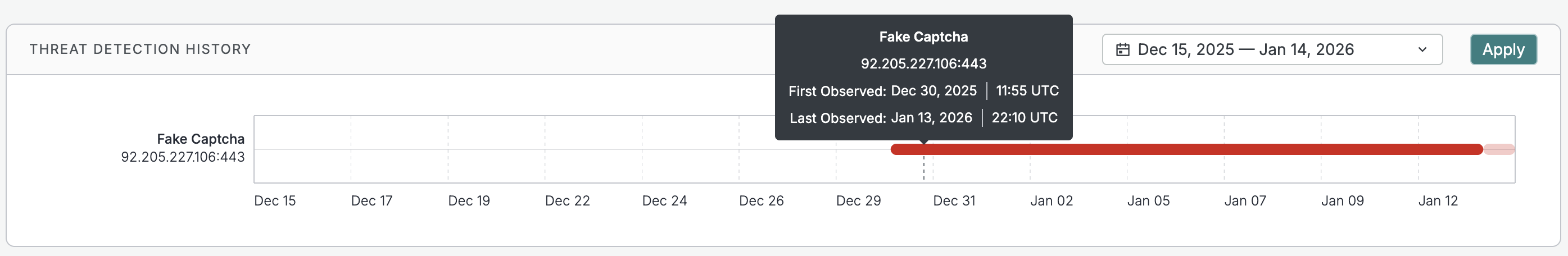 The Threats tab features a chart that shows the historical detections of threat fingerprints on a host or web property. Use this timeline to quickly understand previous threat presence on an asset.